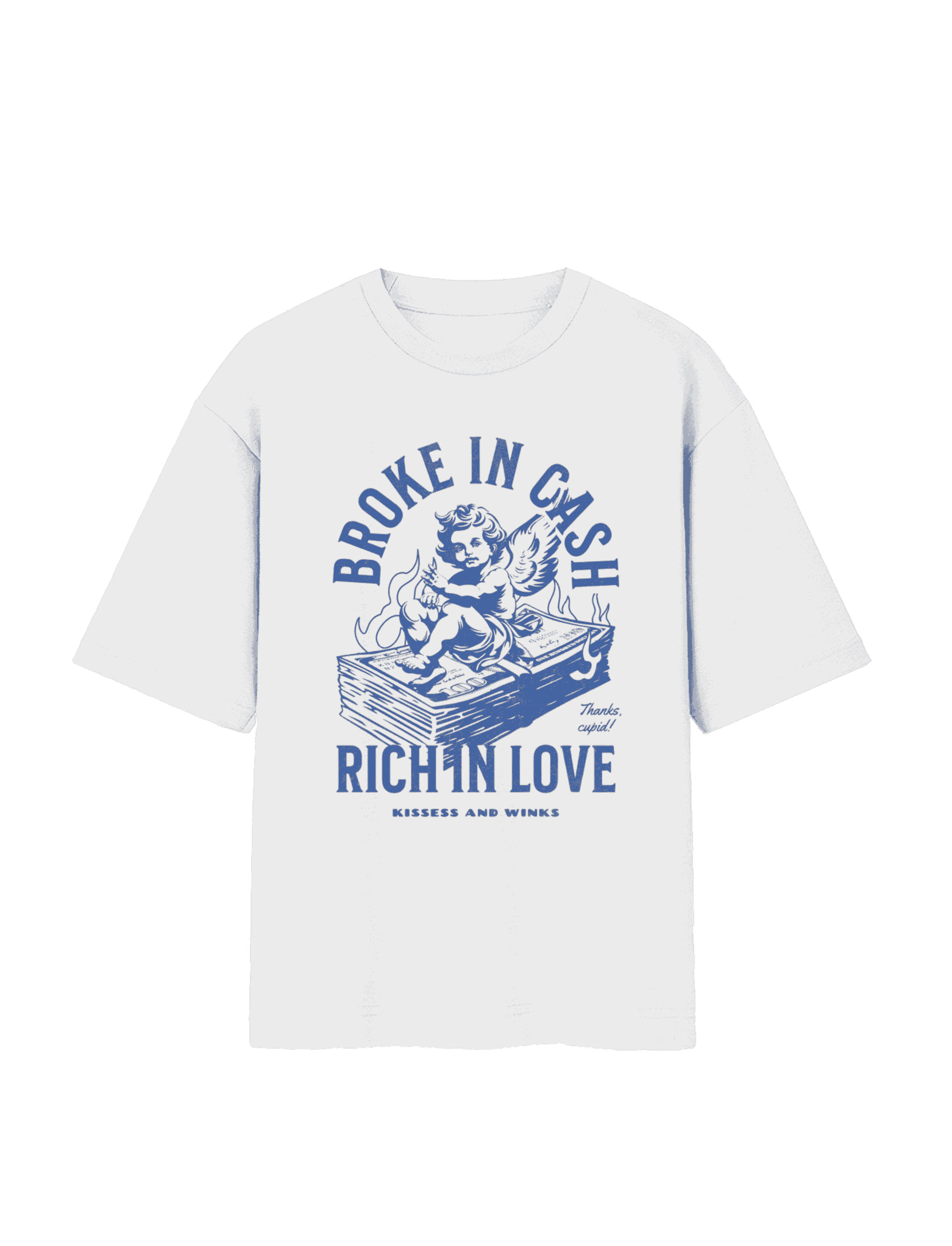 Who needs a fat wallet when your heart’s overflowing? This tee is for the romantics who’ve mastered the art of living off vibes and affection. A cheeky cherub lounges on a bed of burning bills, because hey—love’s the real currency, and you’re already loaded. 💘