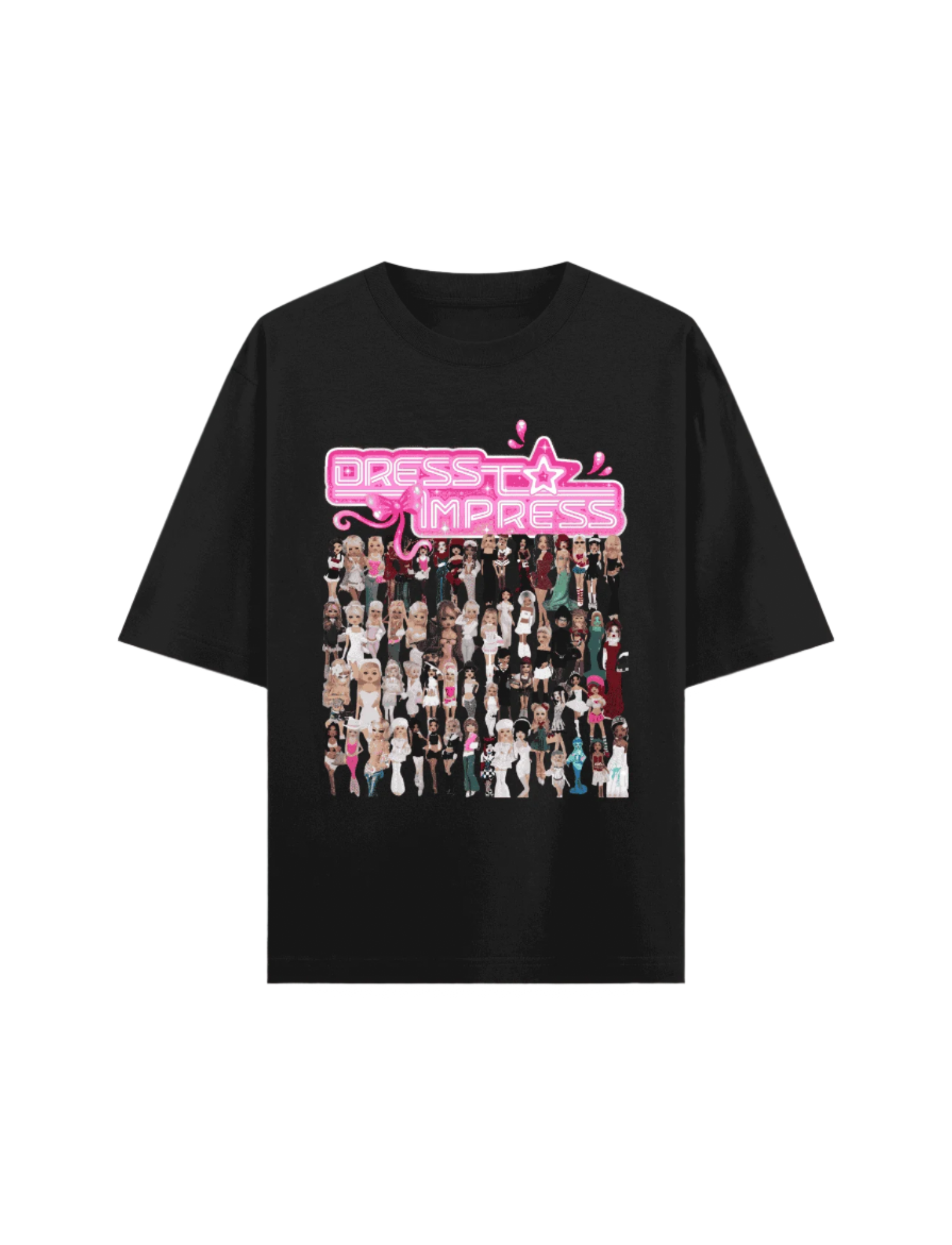 A chaotic masterpiece straight out of Roblox fashion week. This tee features an army of glammed-up avatars from Dress To Impress, each serving a different look, yet all screaming “main character energy.” It’s digital runway meets pixelated drama.