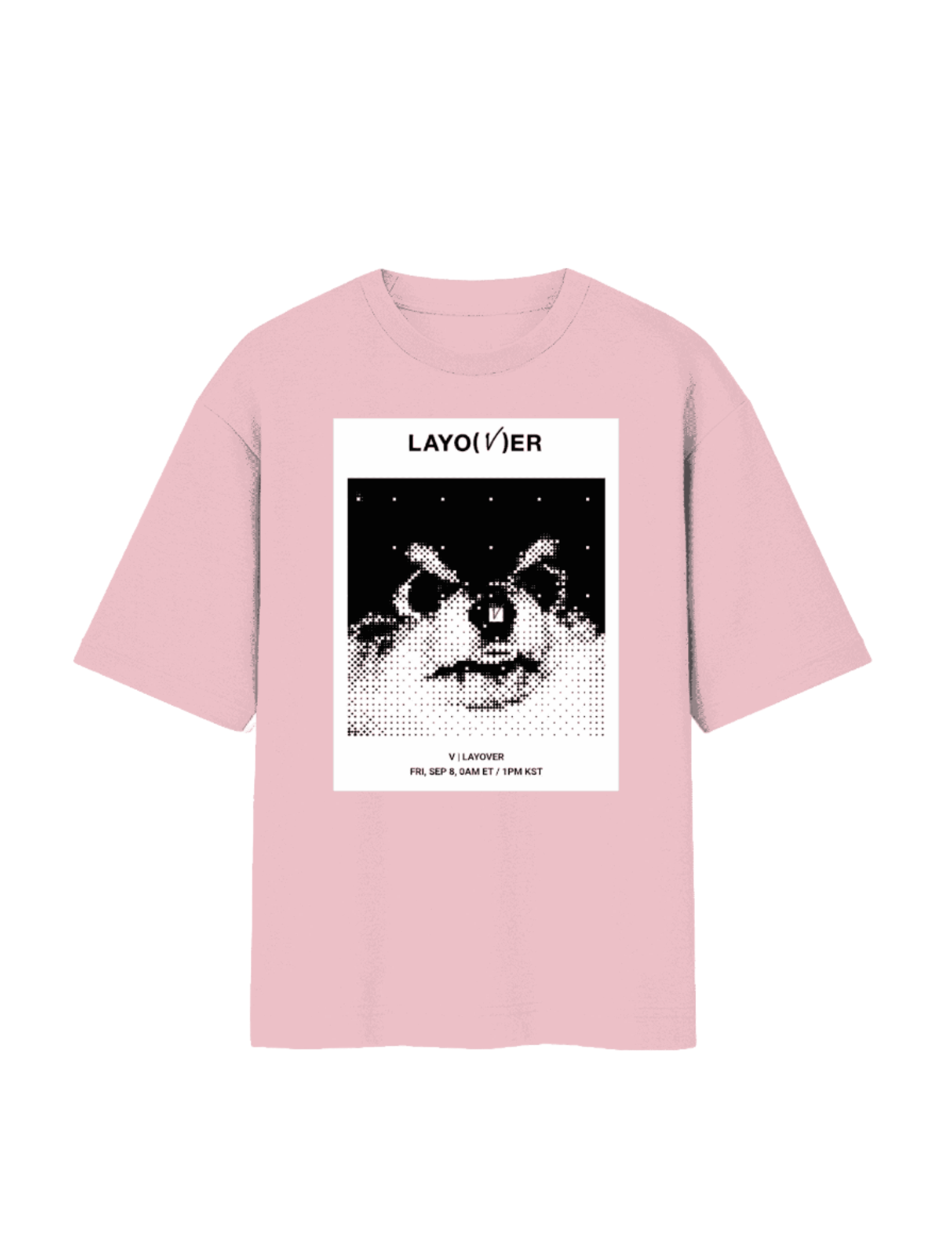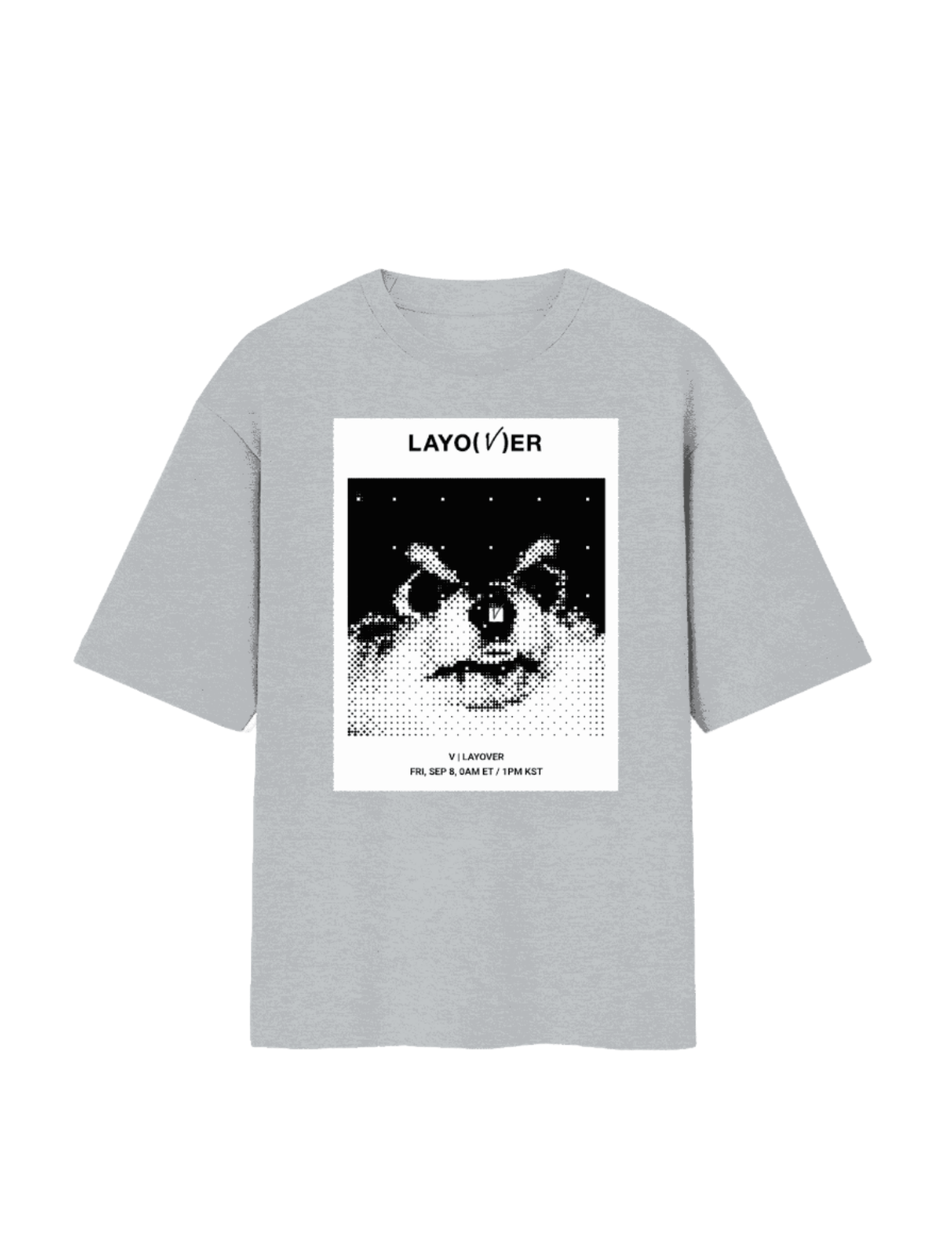 A must-have for BTS ARMY and V (Taehyung) fans, this minimalist yet bold tee features the official album art from his solo project LAYO(V)ER. With a pixelated, dreamy design and a soft lavender hue, this tee embodies the album’s soulful and intimate vibe.